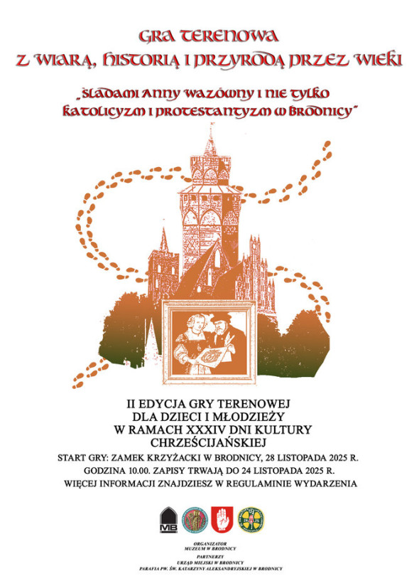 Start gry – 28 listopada br. o godzinie 10.00 na zamku w Brodnicy. Zapisy trwają do 24 listopada, na adres e-mail: [email protected] z dopiskiem: Gra terenowa w ramach XXXIV Dni Kultury Chrześcijańskiej, więcej informacji w regulaminie poniżej.